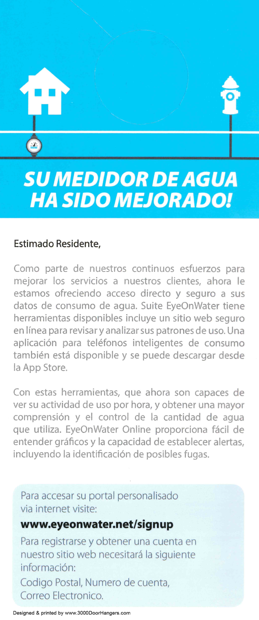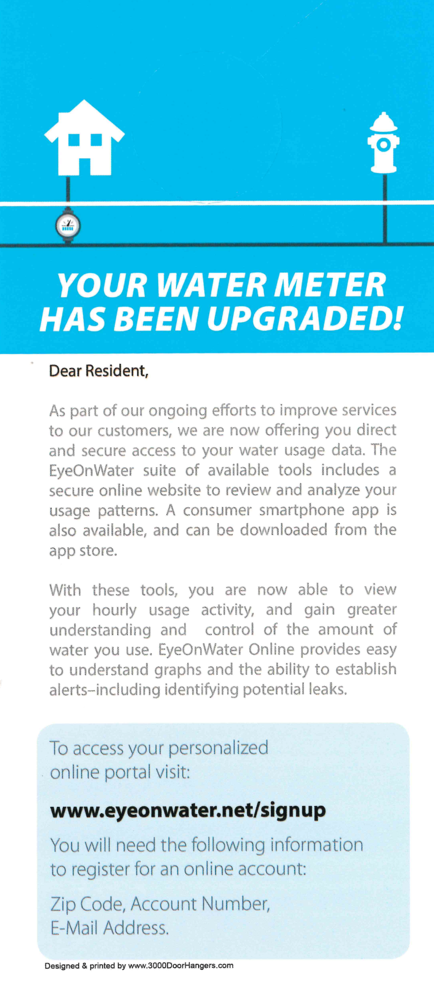 Your water system has been equipped with an Automated Meter Reading (AMR) system. This system provides you, the water account holder, with tools to monitor your water consumption down to the minute, establish your own personal leak alert parameters, and manage your water consumption with more accuracy and reliability. Now that your meter has been changed out, you’ll be able to sign up for EyeOnWater by following these steps: